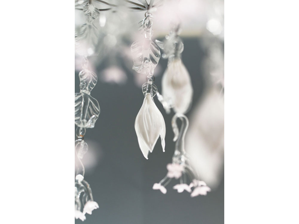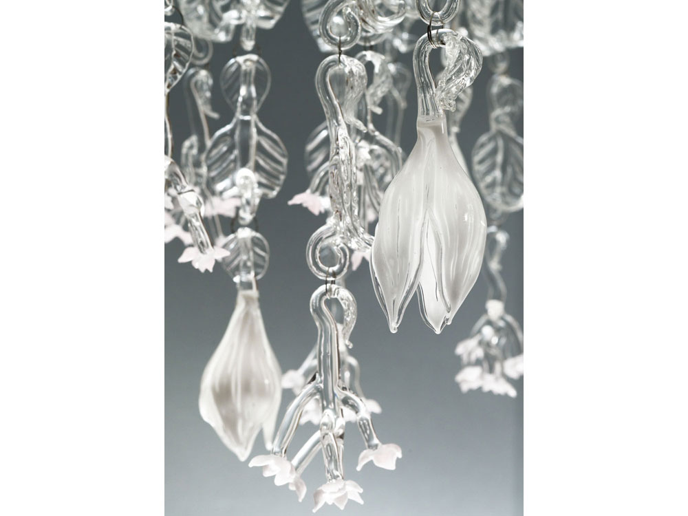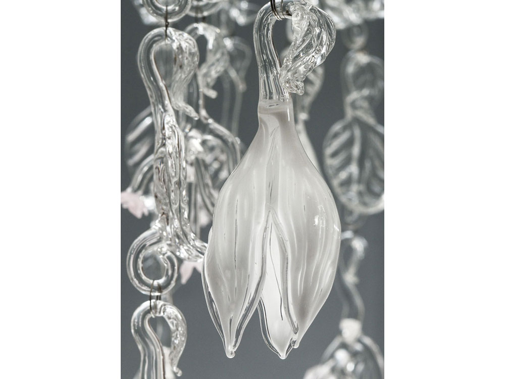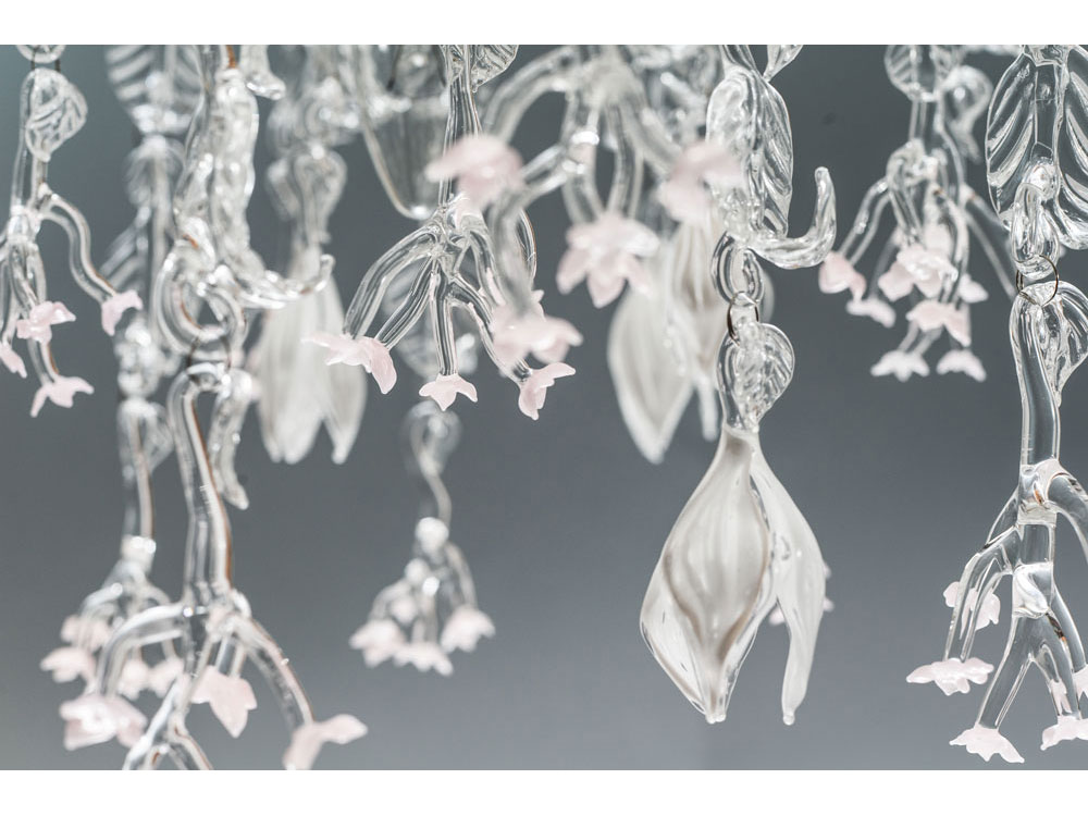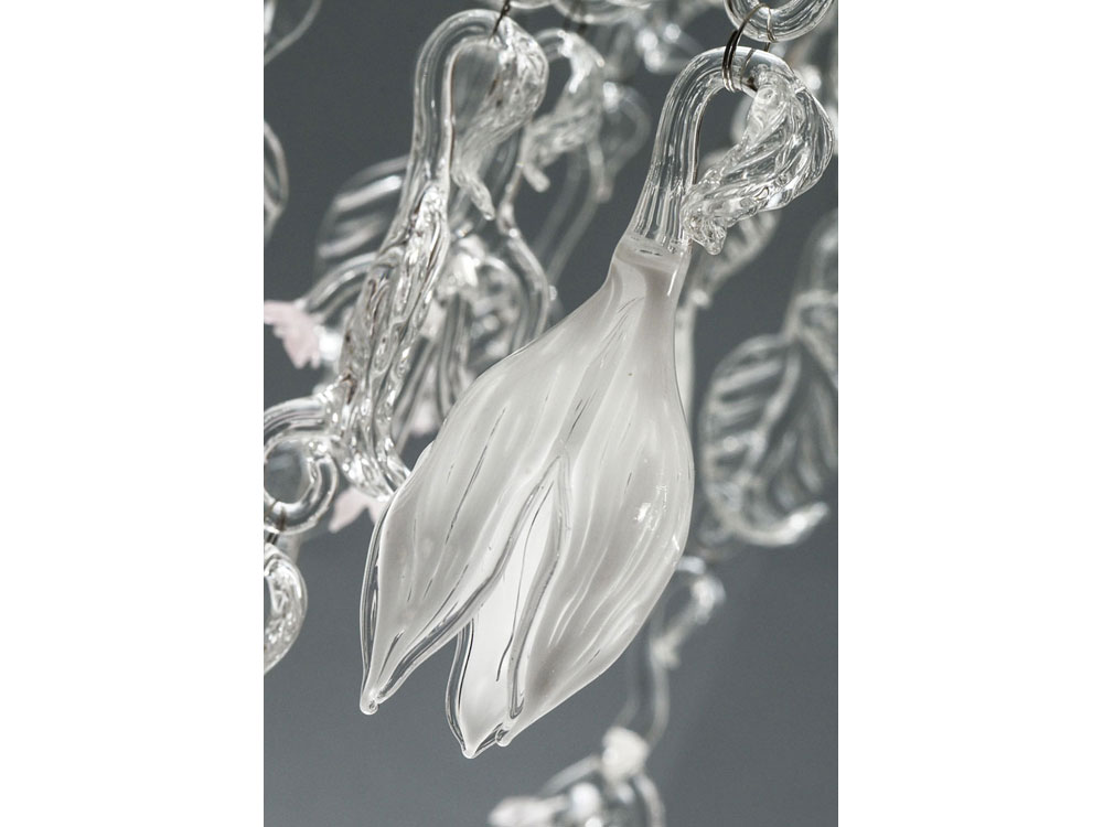 This glass chandelier combines white magnolia flowers and pale blossom with clear glass leaves and branches to add that glassy chandelier sparkle. It continues my love of combining the traditional feel of a glass chandelier with a more contemporary style and as usual, a nod to Arts and Crafts. Each flower has been made using hand-mixed glass cane to add fine detail and all chandelier drops are finished with little leaves.