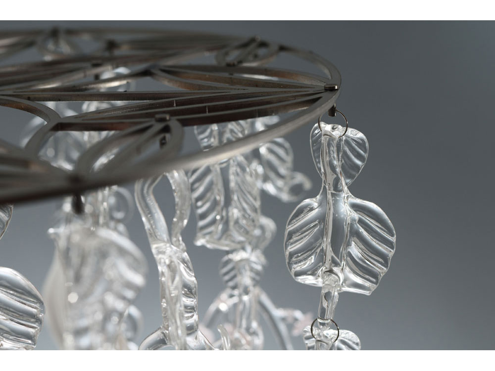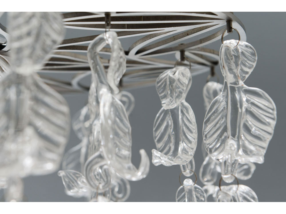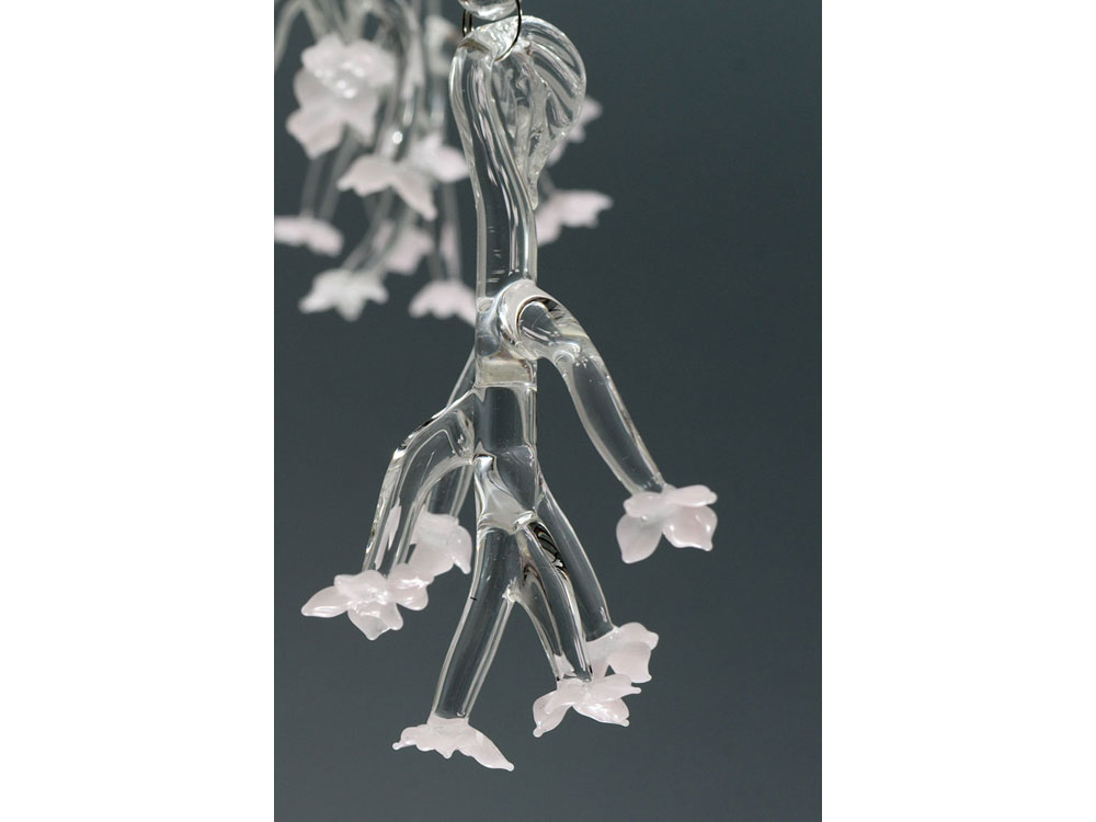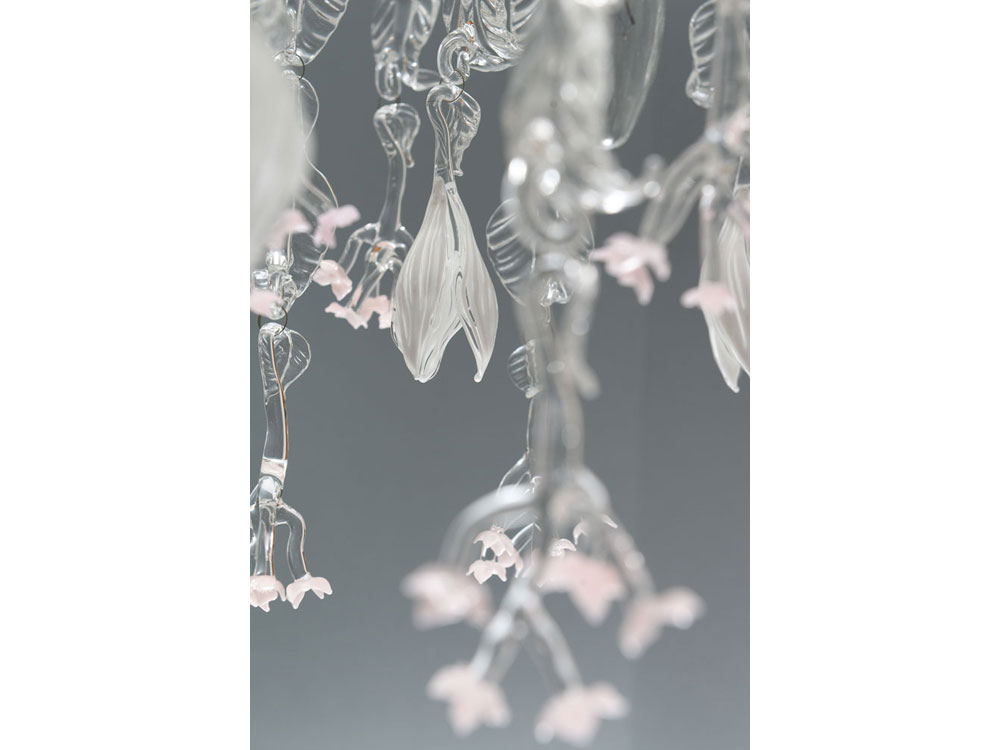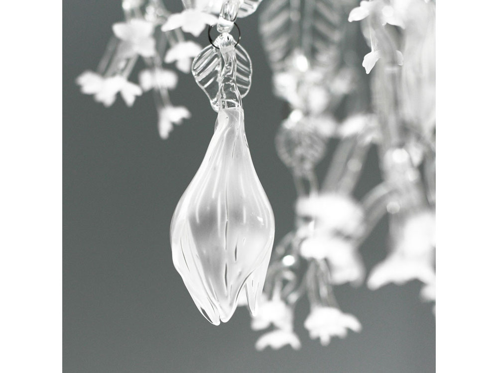 This glass chandelier combines white magnolia flowers and pale blossom with clear glass leaves and branches to add that glassy chandelier sparkle. It continues my love of combining the traditional feel of a glass chandelier with a more contemporary style and as usual, a nod to Arts and Crafts. Each flower has been made using hand-mixed glass cane to add fine detail and all chandelier drops are finished with little leaves.